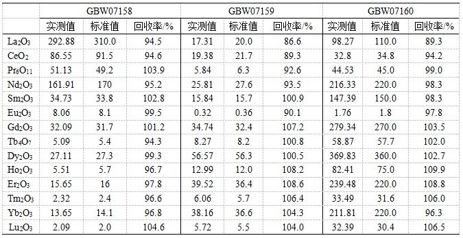 参考《GB/T 40798 离子型稀土原矿化学阐发体例 稀土总量的测定 电感耦合等离子体质谱法》,接纳氢氟酸、硝酸、高氯酸停止湿法消解。操纵碰撞反映情势节制氧化物产率,下降轻稀土氧化物/氢氧化物对其余稀土元素的搅扰;并按照现实样品中元素含量,校准稀土氧化物/氢氧化物的搅扰。对三个稀土矿规范物资中14种稀土元素(以氧化物情势表现)停止测试,各元素收受接管率为86.6 %~109.9%。
