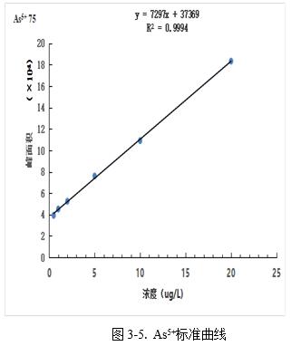 图4为5.0µg/L混和规范溶液色谱图,以各形状峰四周基线处的3倍信噪比(S/N)峰高对应的浓度作为检出限,AsC、As3+、DMA、MMA、As5+别离为0.078µg/L、0.10µg/L、0.11µg/L、0.13µg/L、0.16µg/L。