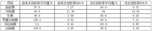 在饮水和河流中干预0.5ug 6种硅化物磷混标,分离作几次成平行线样,按处理试品的体例停掉试品前处理,GC-MS 6800测试仪,容忍外标规定量,在乎其收受交接率,数据源见下表: